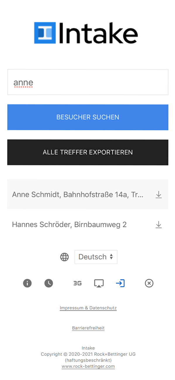 Intake bietet auf einfache Weise dem Besucher die Möglichkeit, die persönlichen Kontaktdaten digital zu hinterlegen. Diese können beim Einlass einer Veranstaltung beispielsweise auf dem Smartphone oder der Smartwatch - aber auch auf einem Papierausdruck - vorgezeigt werden und so kontaktlos und unter Einhaltung datenschutzrechtlicher Bestimmungen übertragen werden.