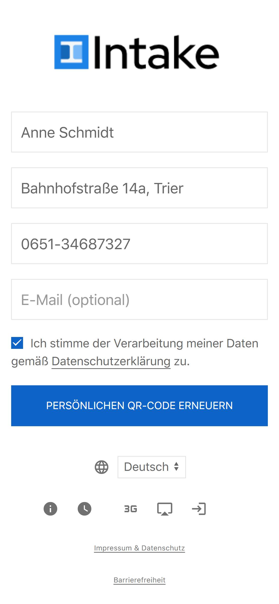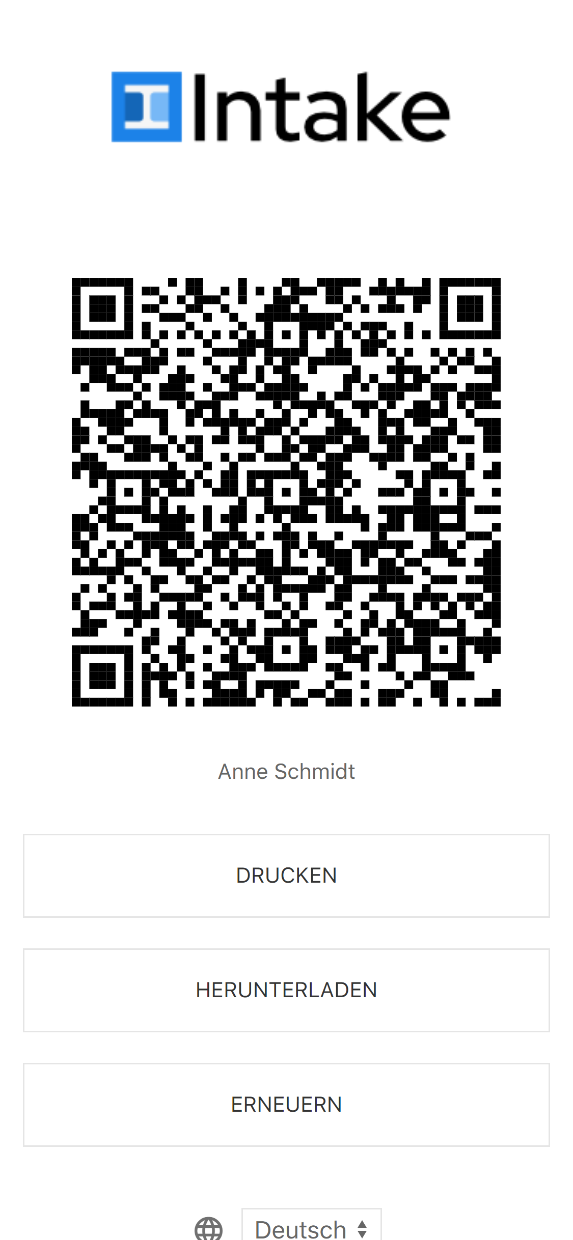 Intake bietet hier auf einfachste Weise Abhilfe: Der Gast erzeugt einmalig auf seinem Smartphone einen persönlichen QR-Code, welcher auf dem Gerät gespeichert wird und somit beim nächsten Besuch nicht erneut eingegeben werden muss. Dieser QR-Code kann auch auf Papier ausgedruckt und zum Besuch mitgenommen werden.